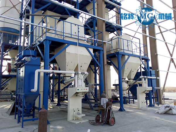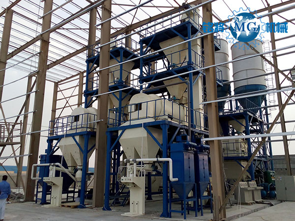 鄭州銘將機械設(shè)備有限公司研發(fā)生產(chǎn)的全自動保溫砂漿生產(chǎn)線,一般情況下會用到4-6個原料罐,兩個大罐用于裝放散裝水泥和粉煤灰,其余小罐用于裝放輕鈣、重鈣、砂、小料等。散裝水泥和粉煤灰進罐不需要提升設(shè)備,依靠泵車打入。輕鈣、重鈣、砂、小料等需要使用斗式提升機提入小罐,巧妙的物料分配系統(tǒng)支持一個斗式提升機分配式作業(yè),從而避免了資源浪費。計量系統(tǒng)在計量螺旋的配合下,把料倉中的原料導(dǎo)入計量倉,通過傳感器的數(shù)據(jù)反饋,實現(xiàn)原料計量。計量好后的物料,通過螺旋輸送機導(dǎo)進主斗提機,提升到混合機上部待混料倉中。待混倉為氣動大開門型,可以迅速將待混物料放入無重力混合機,實現(xiàn)保溫砂漿連續(xù)生產(chǎn)。
