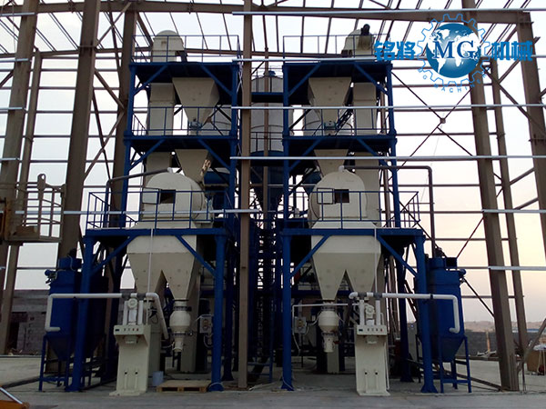 成品倉和二次混合消除了纖維多、流動性差、顆粒料出現(xiàn)容易結(jié)橋和附著現(xiàn)象。該系統(tǒng)實現(xiàn)了快速,連續(xù)出料,對特種原料成品倉加上氣浮裝置能順利出料。