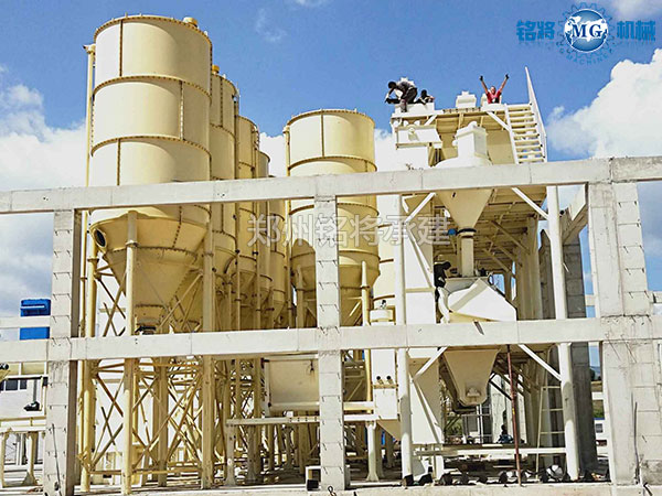 由鄭州銘將最新設(shè)計的年產(chǎn)10-30萬噸全自動預(yù)拌砂漿生產(chǎn)線主要由砂子烘干系統(tǒng)及預(yù)拌砂漿混合系統(tǒng)兩部分組成。亦可根據(jù)需要增配破碎制砂系統(tǒng)。主要包含砂子烘干系統(tǒng)、篩分系統(tǒng)、原料儲存系統(tǒng)、自動配料系統(tǒng)、氣動系統(tǒng)、除塵系統(tǒng)、成品包裝系統(tǒng)、散裝罐車包裝系統(tǒng)、及自動控制系統(tǒng)等,如需要可在此基礎(chǔ)上增配實時動態(tài)監(jiān)控。