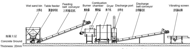 石英砂烘干機是由三個不同直徑的同心圓筒按照一定的數(shù)學關系和結構形式,彼此相嵌組合而成的。根據(jù)熱功原理,筒內裝有不同角度和間距的揚料板和導料板,這種結構能夠保證被烘干物料在重力作用下沿著螺旋的運動方向運動,在筒內保持足夠的停留時間和充分的分散度,致使物料在筒內與來自燃燒室內的熱氣流進行充分的熱交換,消除了常規(guī)烘干設備截面常出現(xiàn)風洞而引起的熱交換面積小、單位容積蒸發(fā)強度低的缺陷。特殊的三筒結構,使內筒和中筒被外筒包圍而形成了一個自身保溫系統(tǒng),內、中筒體表面散發(fā)的熱量參與到外一層筒內物料的熱交換,而外筒又處在熱氣流的低溫端,所以筒體的散熱面積和熱能損失明顯降低。節(jié)能型三筒烘干機能充分利用余熱,減少散熱損失,增加熱交換面積,使烘干機的單位容積蒸發(fā)強度大大提高,從而有效地提高了熱能利用率,降低了能耗,使石英砂烘干機的熱效率得到較大幅度的提高。