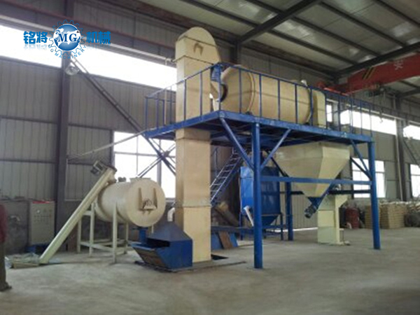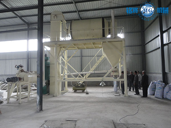 該生產(chǎn)線由臥式螺帶混合機(jī)、斗式提升機(jī)、;⒅闈L筒混合機(jī)、自動包裝機(jī)和除塵設(shè)備組成。該套生產(chǎn)線先將填充物料通過臥式螺帶混合機(jī)進(jìn)行預(yù)混,然后再與;⒅樵跐L筒混合機(jī)中進(jìn)行混合,既減小;⒅榈钠茡p又使物料得到充分的混合,保證產(chǎn)品的質(zhì)量。另外該套設(shè)備配備一到兩臺脈沖式除塵器大大改善工作環(huán)境,減少粉塵對人體的傷害是做無機(jī)保溫建材中小型企業(yè)的理想產(chǎn)品。