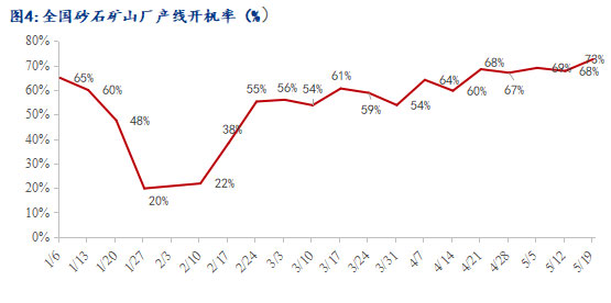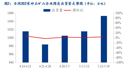 河南駐馬店砂石礦山廠反饋:5月19日,日均出貨量為8000噸,周度出貨量為56000噸,2條線全開。環(huán)比上周增加23000噸,目前周邊城市大部分都已解封,出貨量增加,預(yù)計(jì)下周持平。