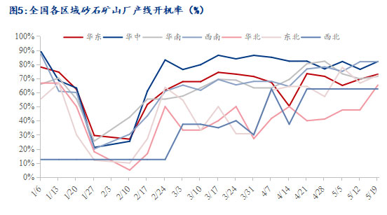 廣東清遠(yuǎn)砂石加工廠反饋:5月19日,2條產(chǎn)線正常開著,砂石周產(chǎn)量近100000噸,但是出貨量不是太理想,周度出貨量70000噸左右。環(huán)比下降5%,廣東地區(qū)近期受到雨水天氣影響,疊加油價(jià)上漲運(yùn)輸成本調(diào)高,項(xiàng)目工程施工進(jìn)度緩慢不前,砂石需求不景氣。